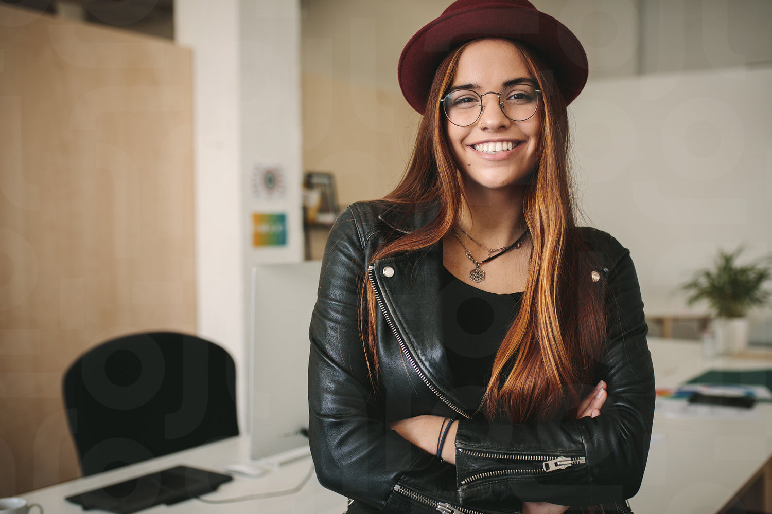 Portrait of a business woman wearing hat and eyeglasses standing in office with crossed arms. Smiling business woman in office standing with arms crossed.