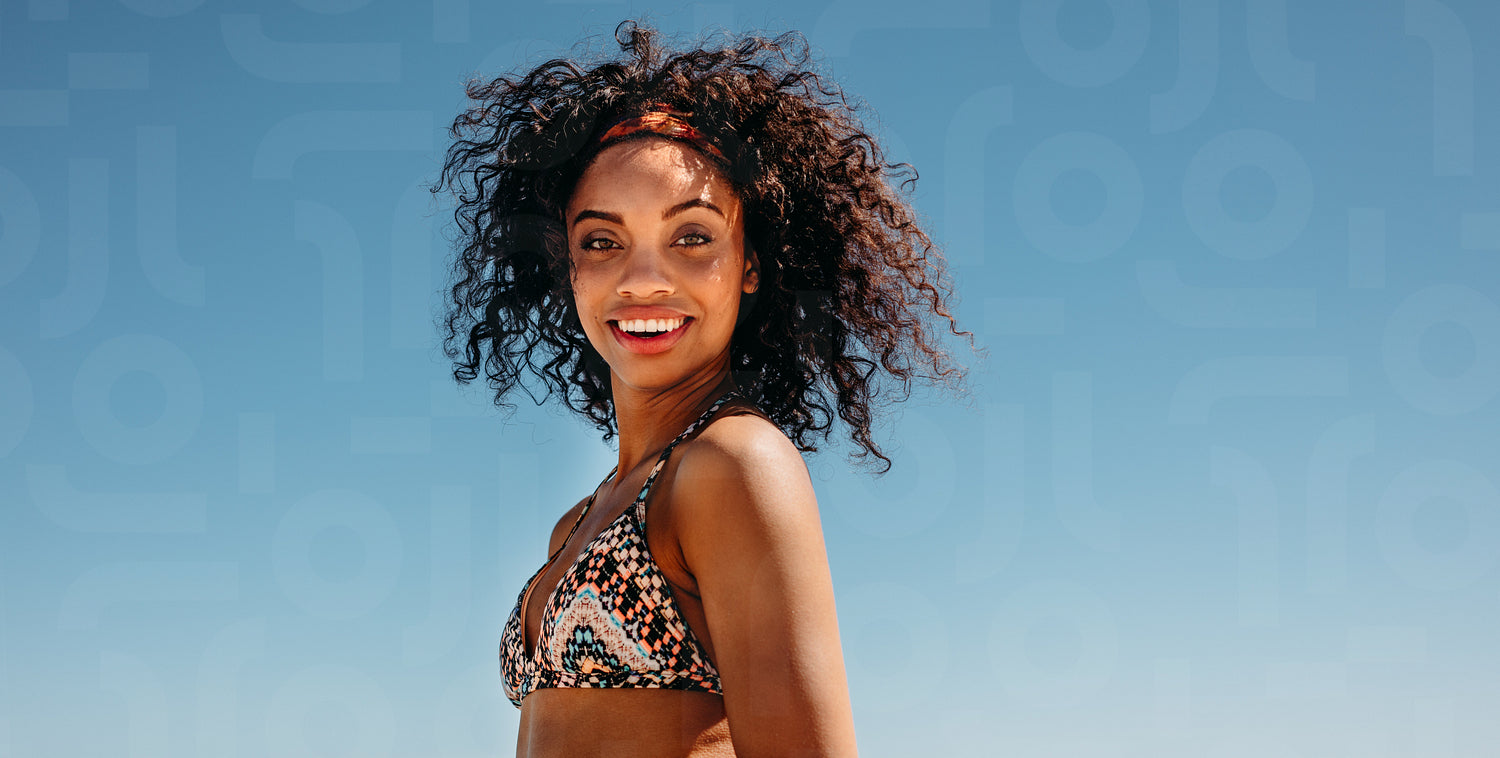 Side view of a cheerful woman with curly hair standing with clear blue sky in the background. Portrait of a woman in bikini on a holiday.