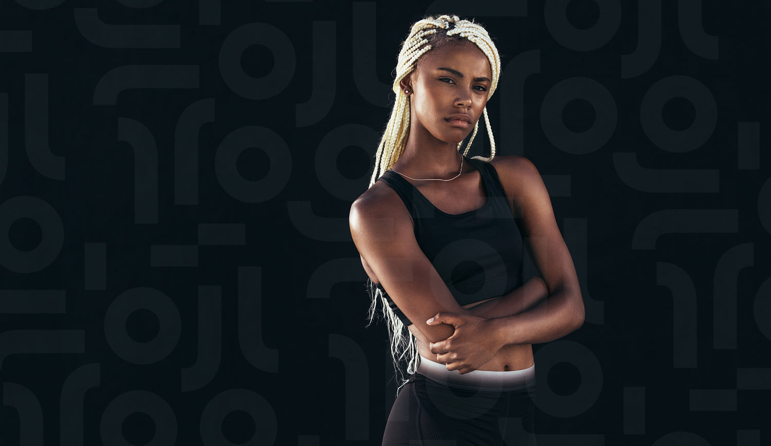 Portrait of a woman athlete standing with arms folded. Fitness woman in training clothes.