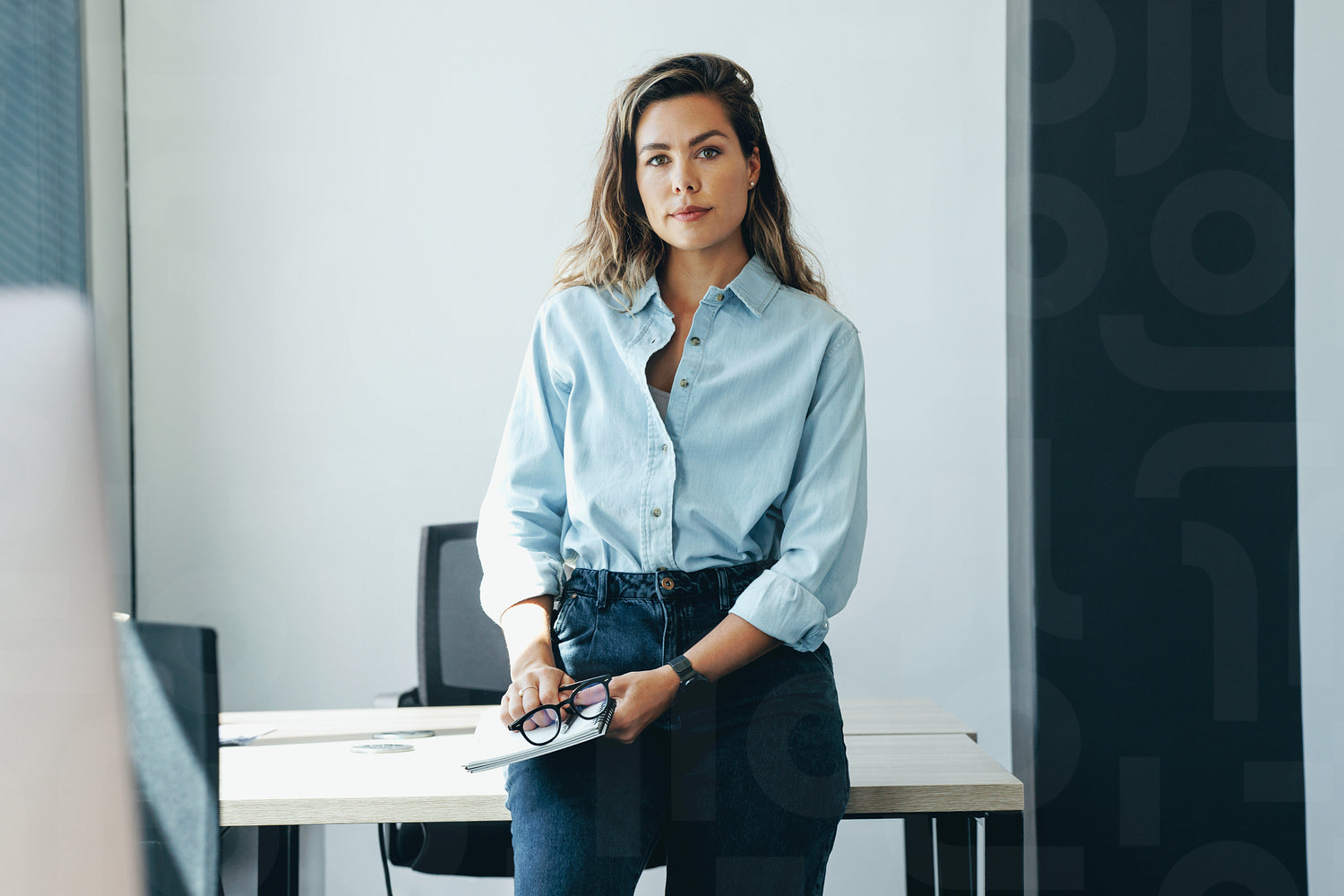 Confident female professional looking at the camera while standing in her office in businesswear. Young business woman holding a notebook in her hands, ready to start a productive day.