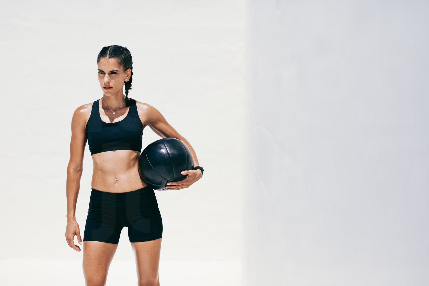 Fitness woman standing with a medicine ball in hand looking away. Female in fitness wear doing workout using a medicine ball.