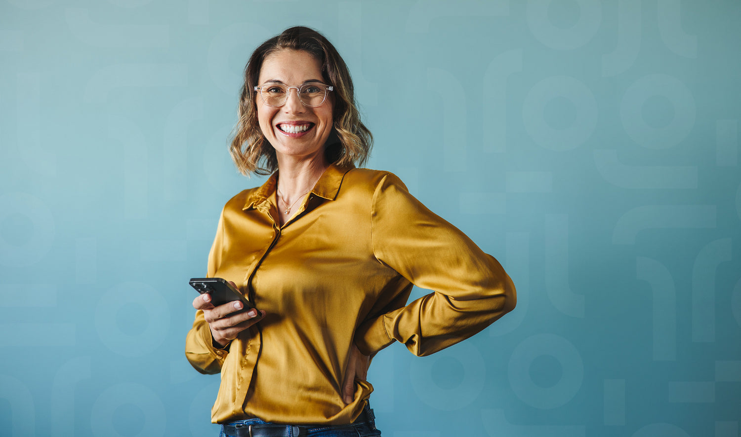 Successful businesswoman smiling with her smartphone in hand, showcasing the power of technology in the world of business. Professional woman using her device to stay informed and run her business.