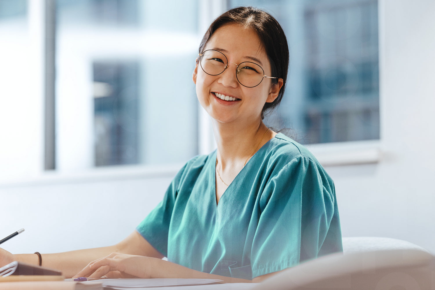 Young Asian woman, dressed in scrubs, looking at the camera in a medical library where she is preparing for an exam. Happy female student studying to be a nurse in nursing school.