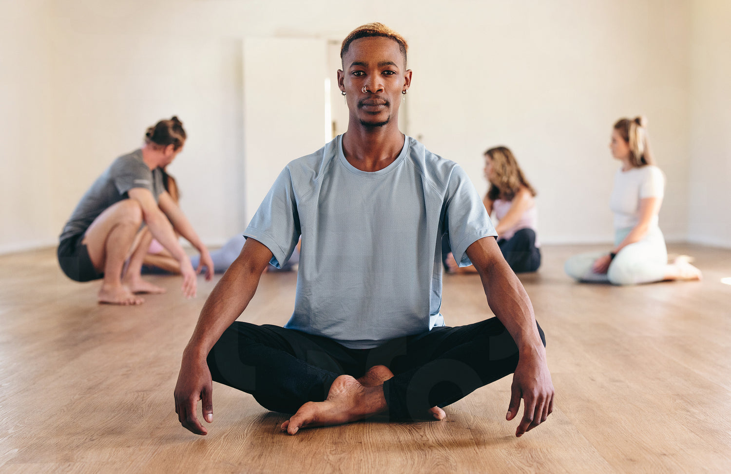 Portrait of a male yogi looking at the camera while sitting in lotus position with a group of people in the background. Young black man attending a yoga class in a community fitness studio.
