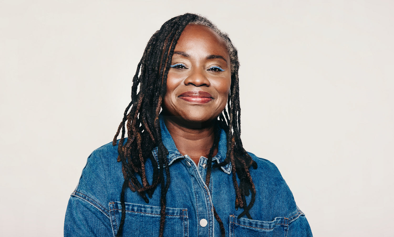 Portrait of a woman with dreadlocks looking at the camera with a smile while standing against a grey background. Stylish mature woman wearing a denim jacket and make-up in a studio.