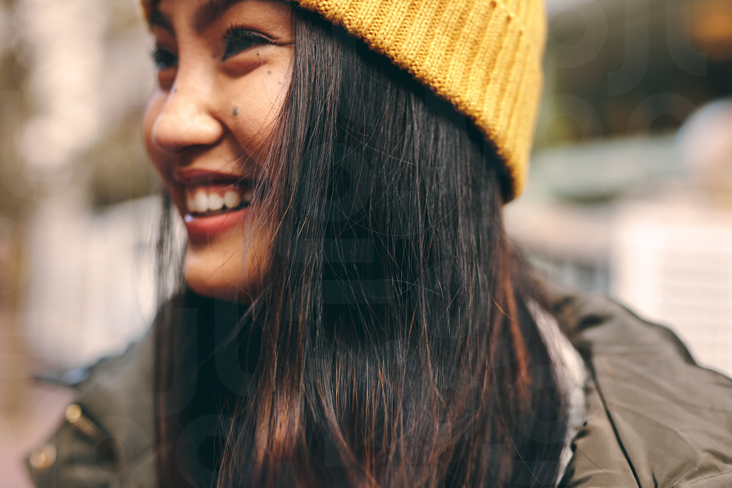 Close up of a smiling woman in winter clothes standing outdoors. Cropped shot of a smiling asian woman in winter cap standing outdoors.