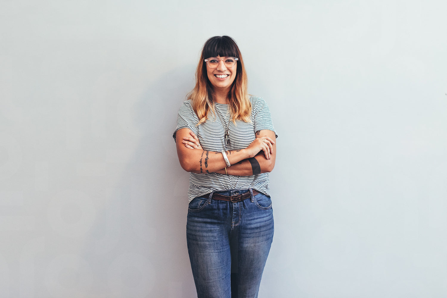 Smiling businesswoman standing against the wall with arms crossed. Cheerful woman in jeans trousers and tshirt standing with folded hands.