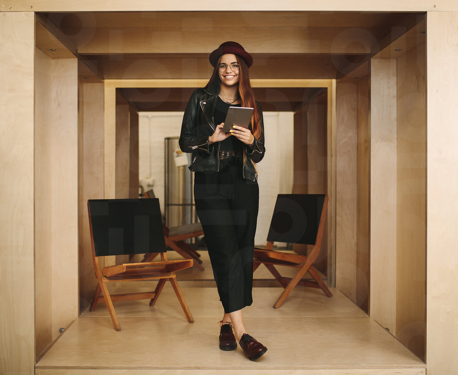 Smiling businesswoman holding tablet pc standing inside an enclosure at office. Woman entrepreneur wearing hat standing in office using a digital tablet.