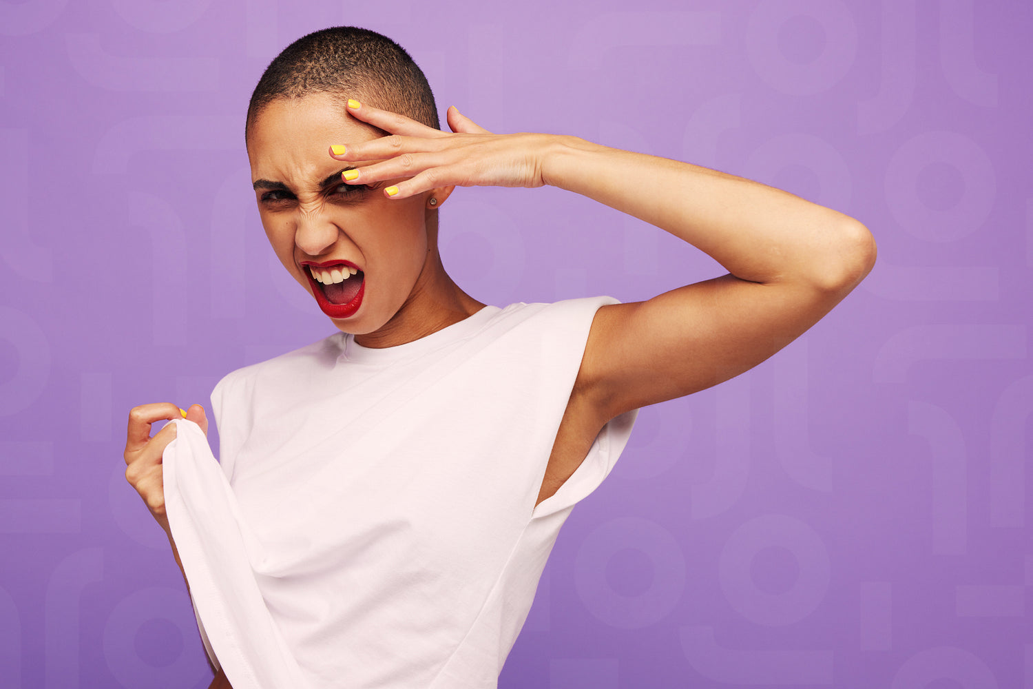 Portrait of a stunning woman with short hair. Female model in while t-shirt looking at camera with cool expression on purple background.