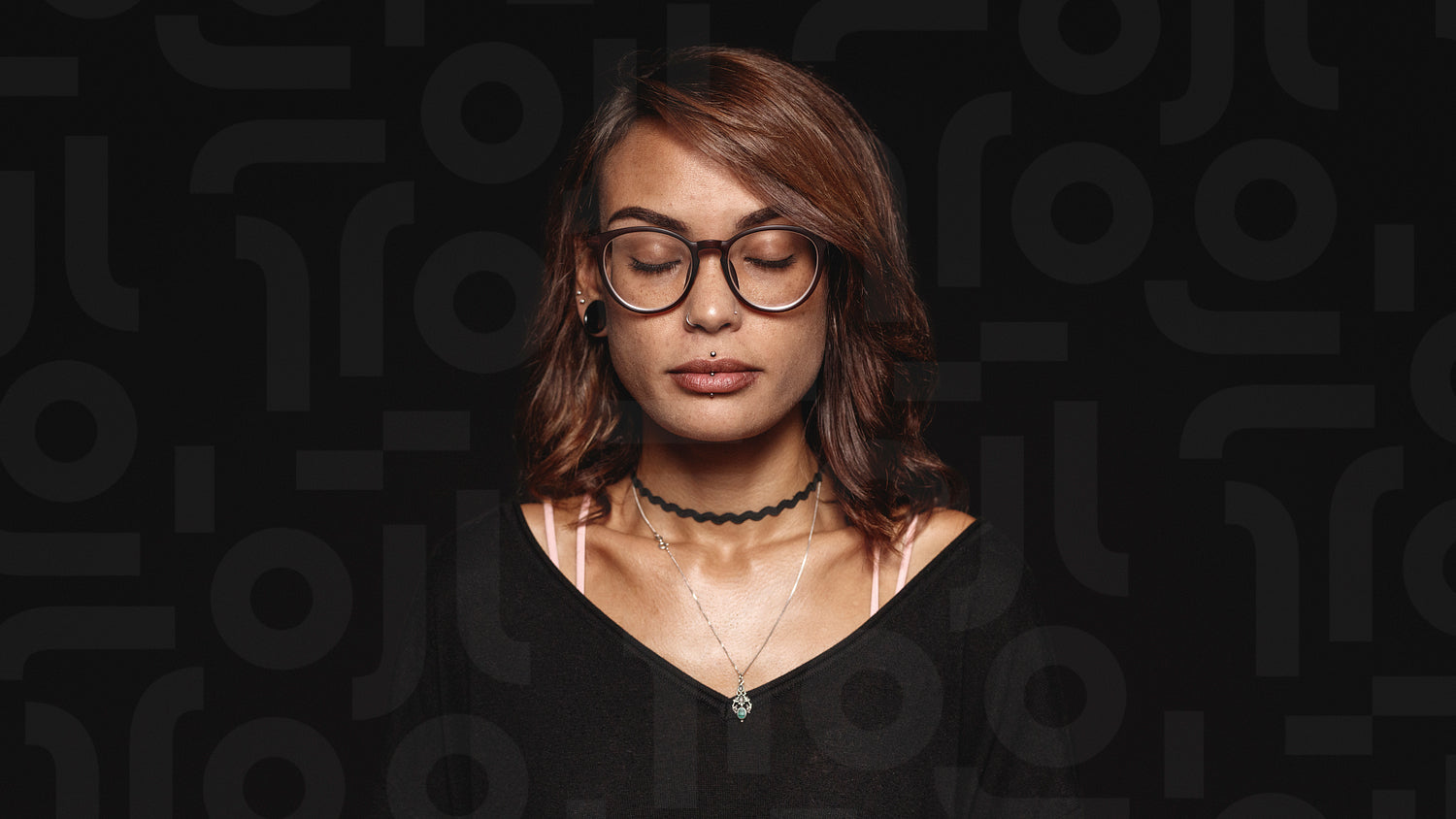 Woman with closed eyes isolated on black background. Portrait of a fashionable woman with eyes closed.