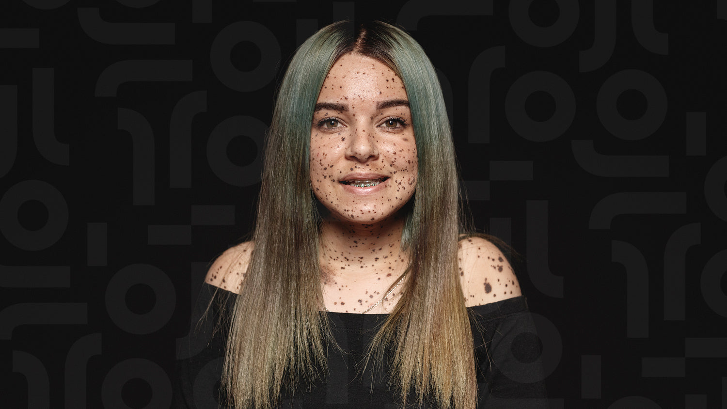 Close up of young woman looking at camera isolated on black background. Smiling woman with mole spots or freckles on her body.