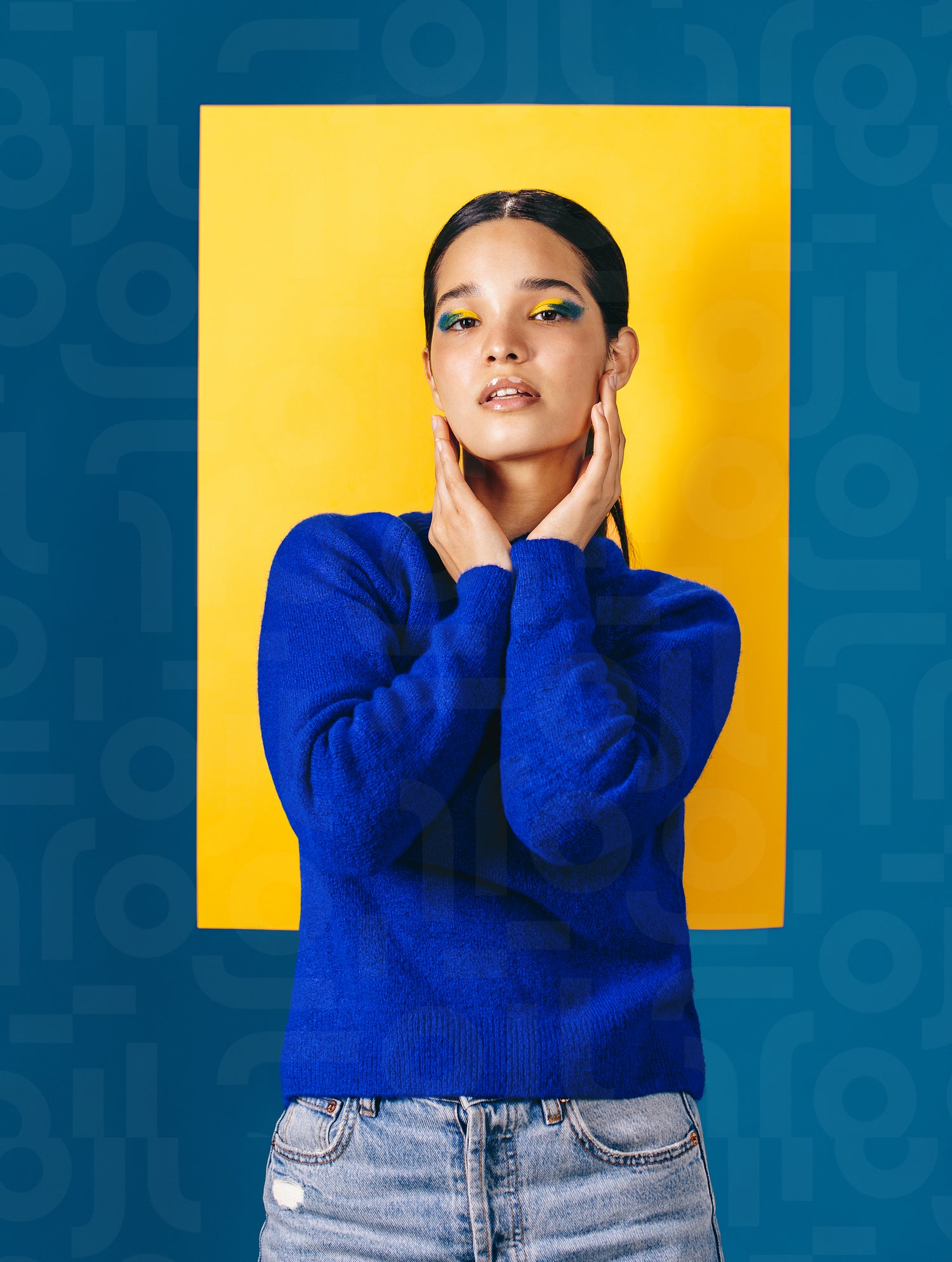 Young woman in her 20’s stands in front of a geometric shape in a studio, wearing bold eyeshadow and casual clothing. This young woman is showing off her confidence and self-assurance, which is represented by her vibrant makeup.