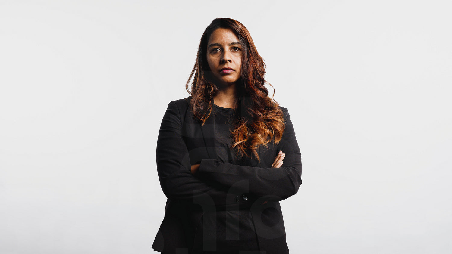 Young businesswoman standing against white background looking at camera. Portrait of businesswoman in formals standing with arms crossed.