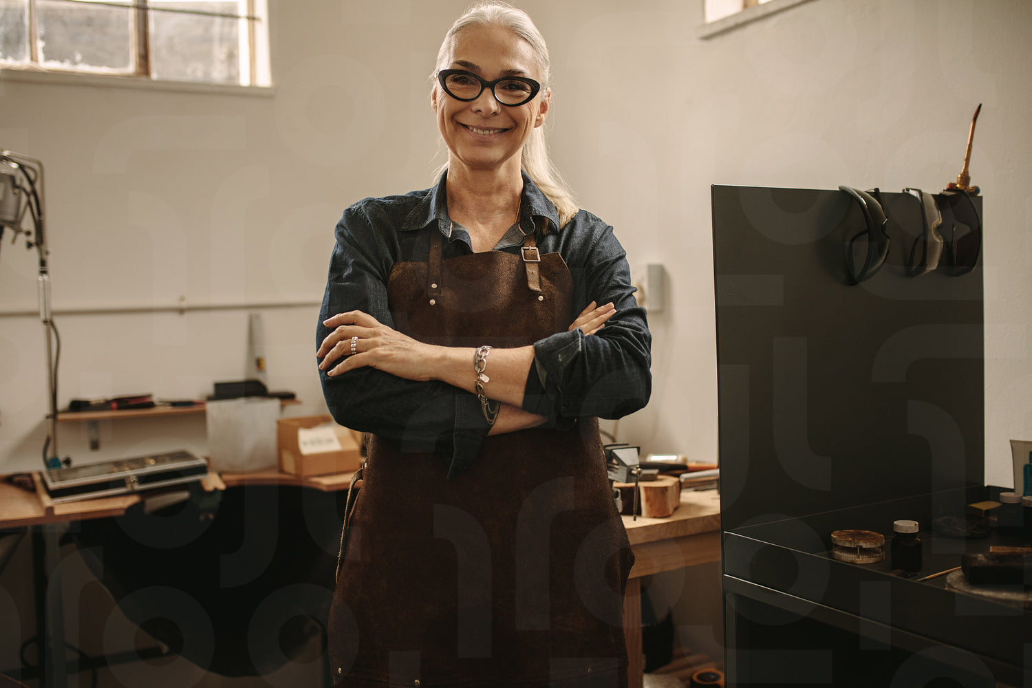 Portrait of confident senior female jeweler standing in her workshop. Woman goldsmith wearing apron and eyeglasses standing with her arms crossed and looking at camera smiling in jewelry making shop.