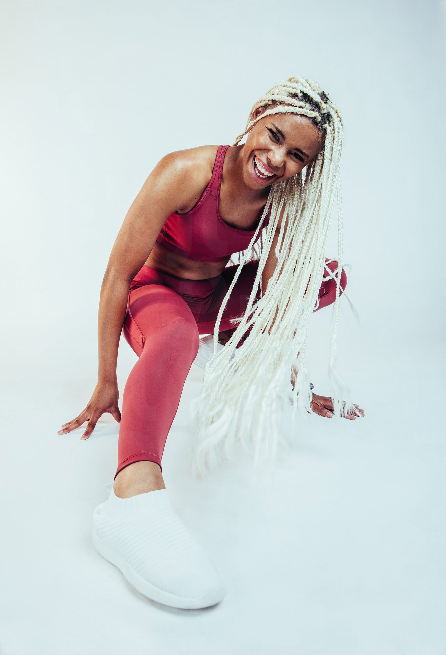 Close up of female athlete enjoying fitness training. African american fitness woman laughing during workout against white background.