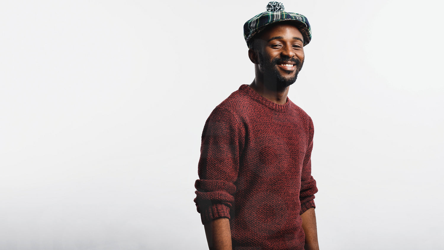 Cheerful man isolated on white background wearing a scottish cap. Side view of african american man in winter woollen clothes looking at camera.