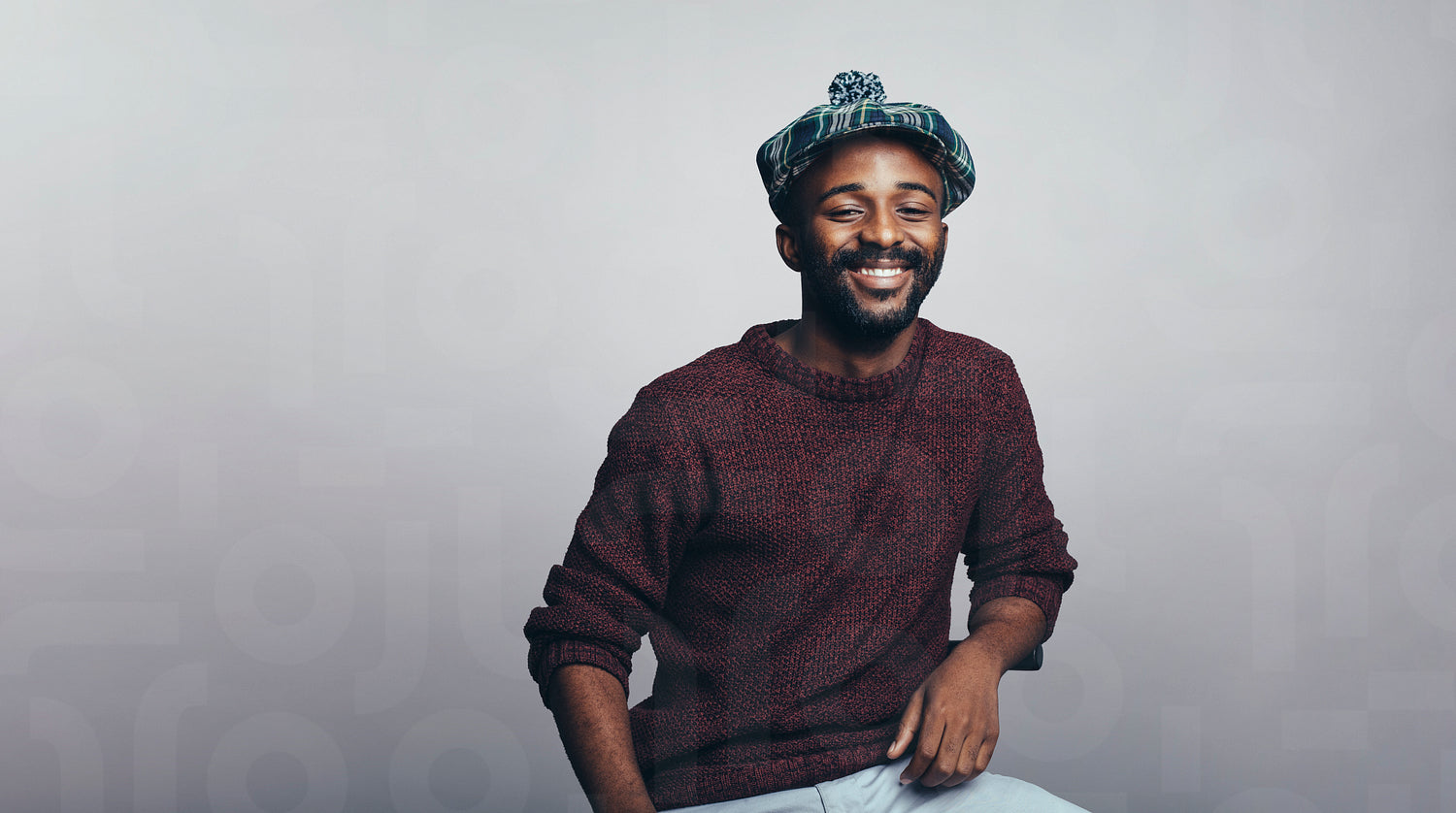 Cheerful man isolated on grey background wearing a scottish cap. Smiling african american man looking at camera.
