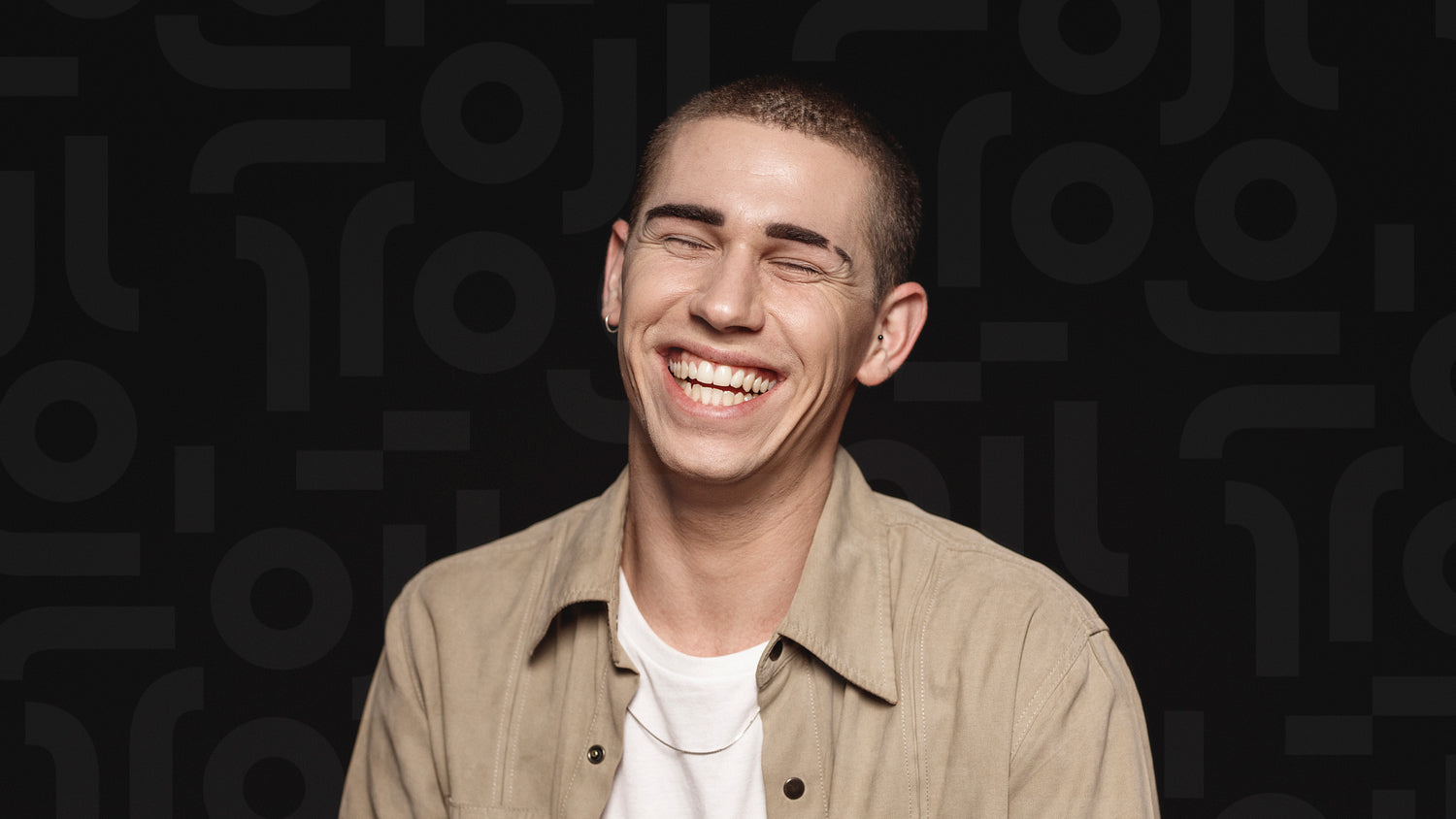 Portrait of a caucasian man laughing with closed eyes. Close up of a man laughing isolated on black background.