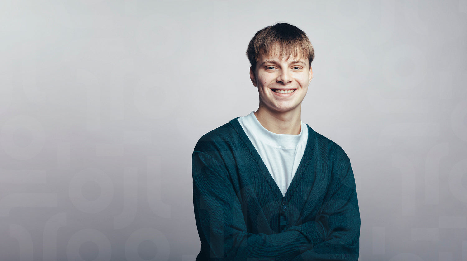 Cheerful man with brown hair standing against grey background. Cheerful young man standing with his arms crossed looking at camera.