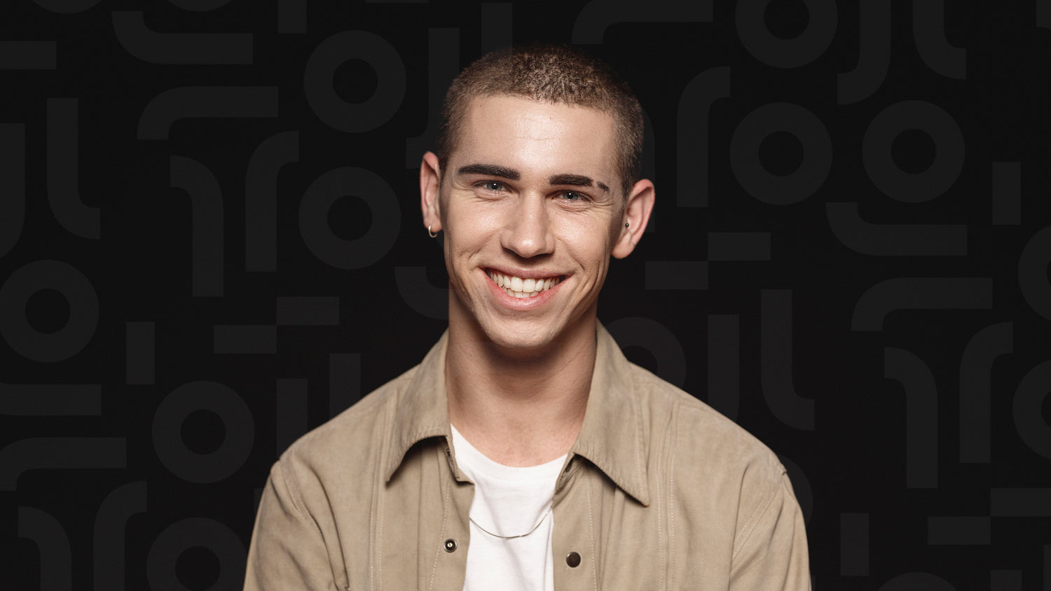 Portrait of a smiling caucasian man isolated on black background. Close up of a happy man looking at camera.