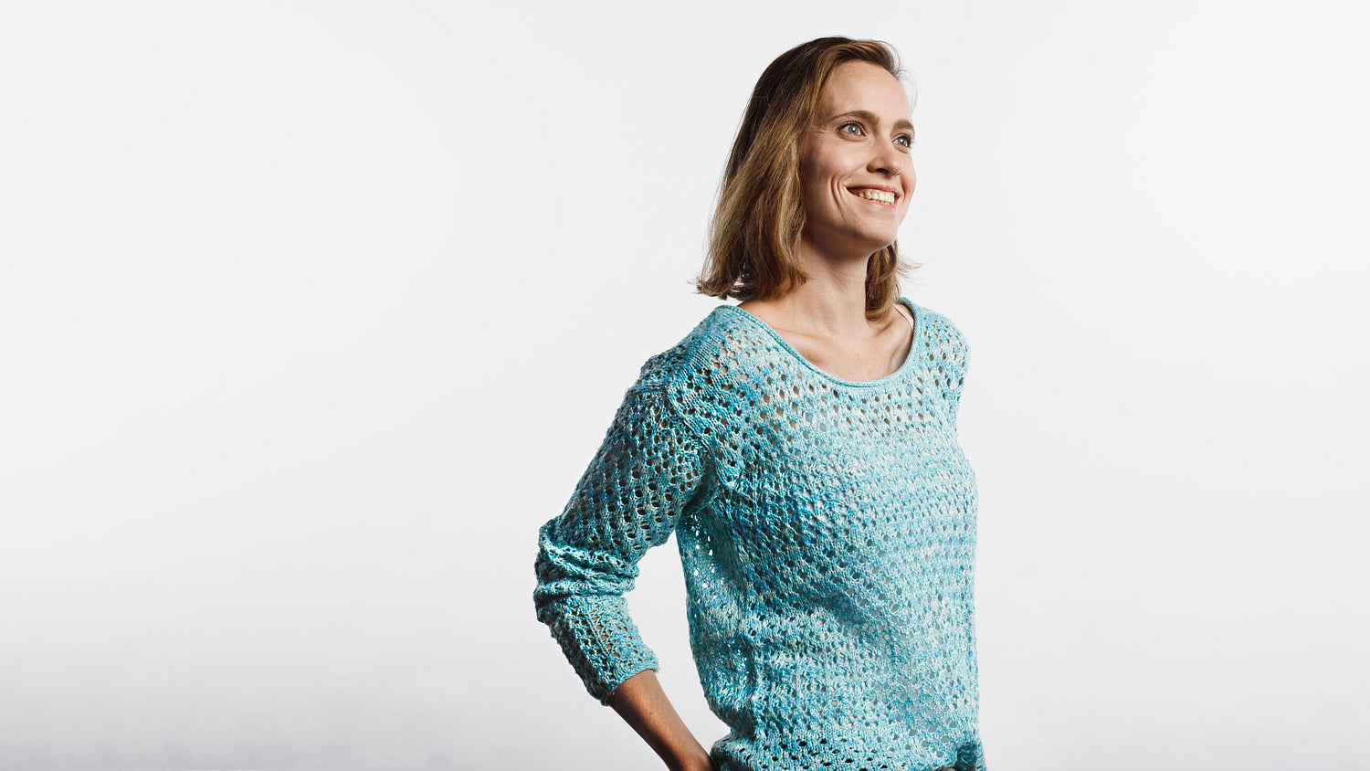 Happy woman wearing a woollen top standing against white background. Smiling woman with short brown hair looking away.