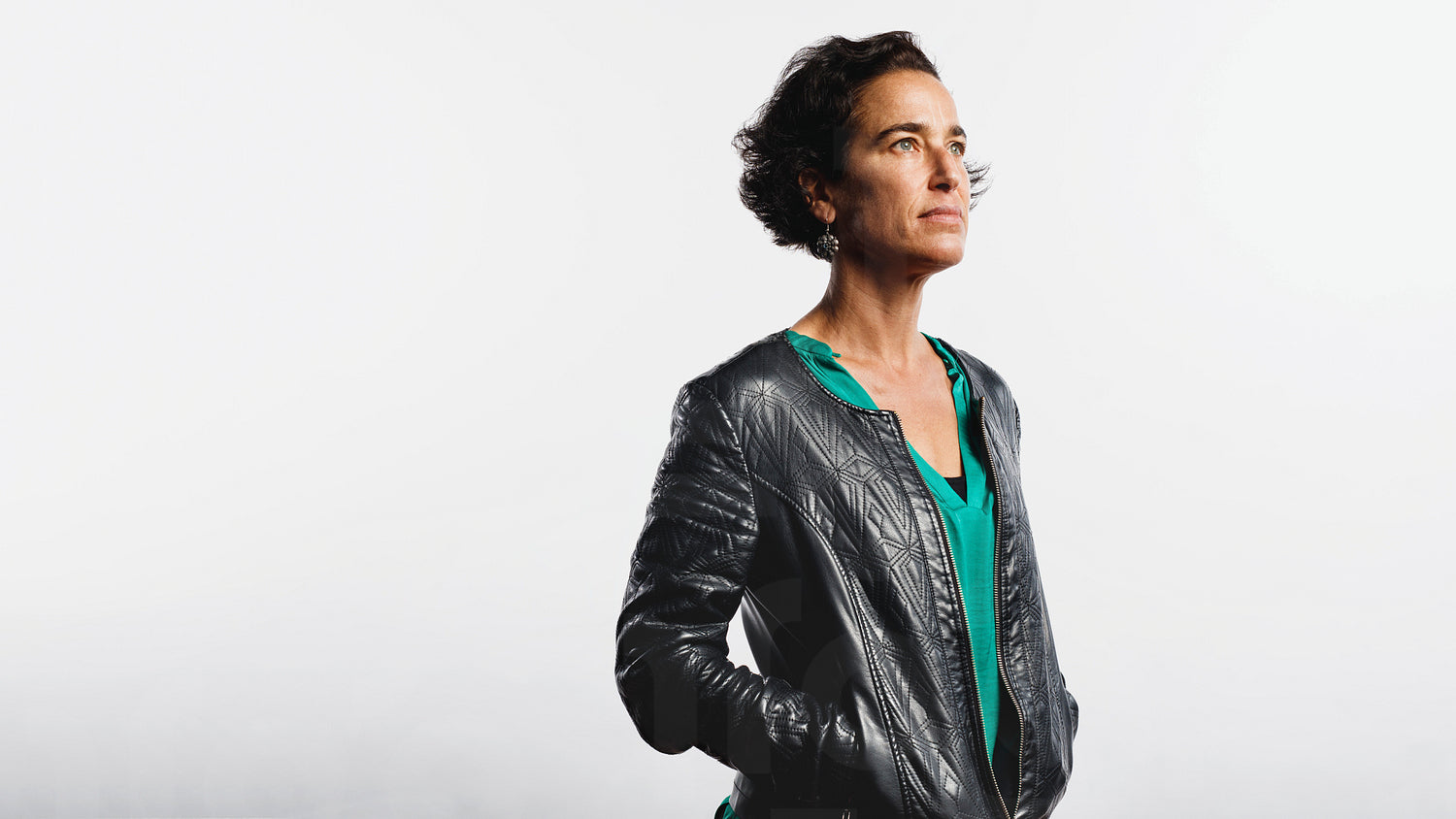 Female standing with hands in pocket of her jacket. Woman with short hair standing against white background.