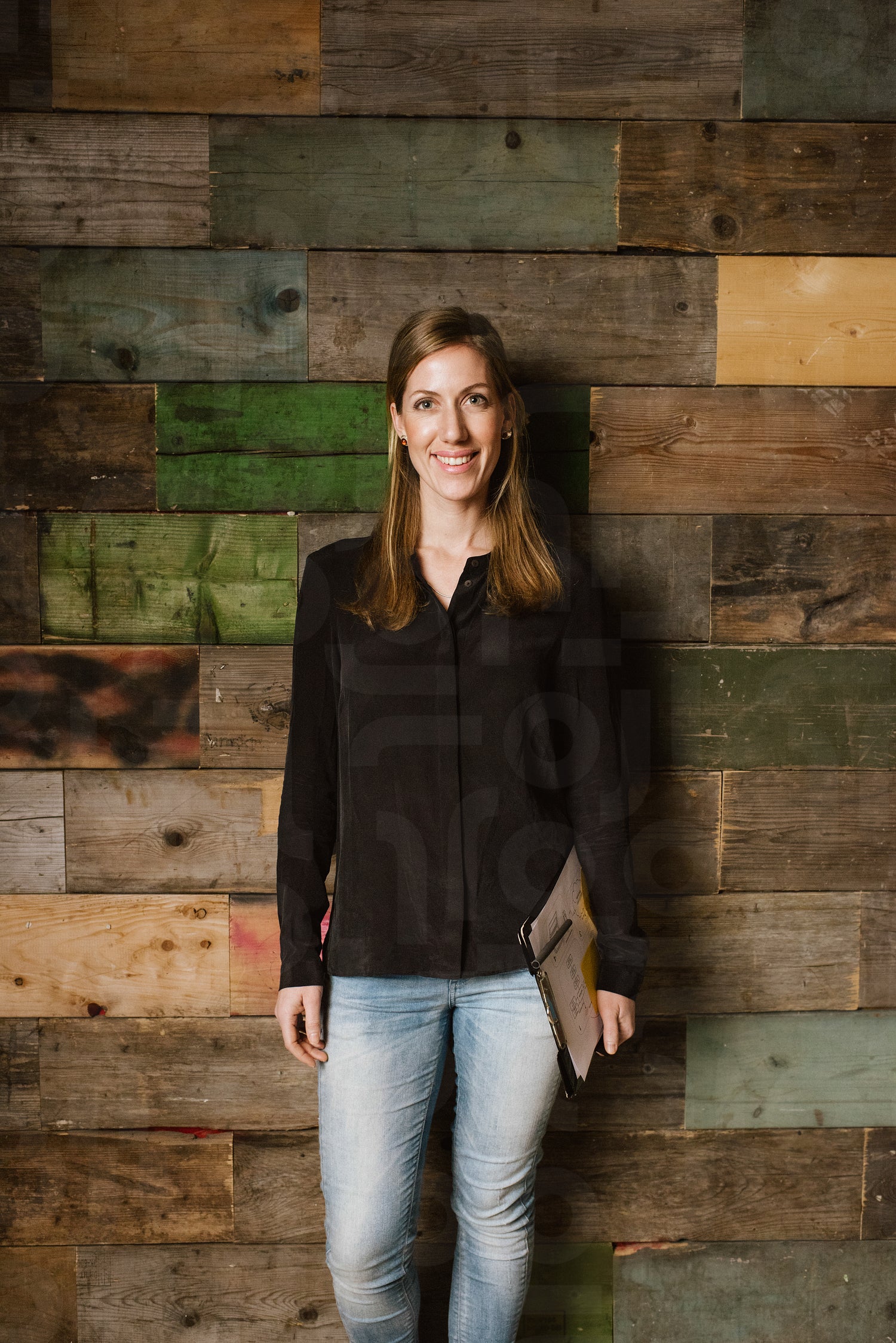 Portrait of young woman looking happy while posing for camera against a wooden wall in office. Young business executive in office.