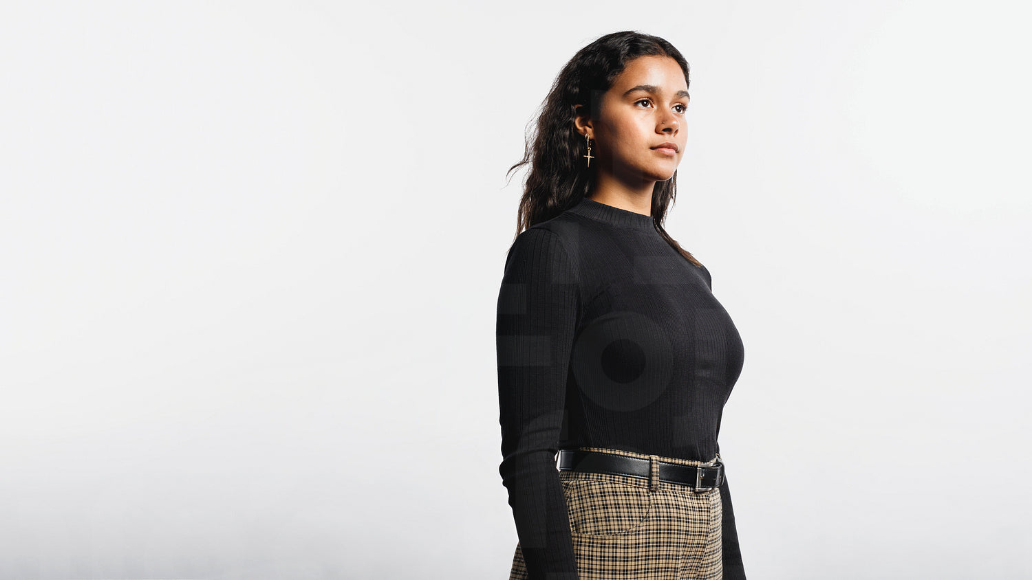 Side view of woman standing against white background. Portrait of young woman looking away.