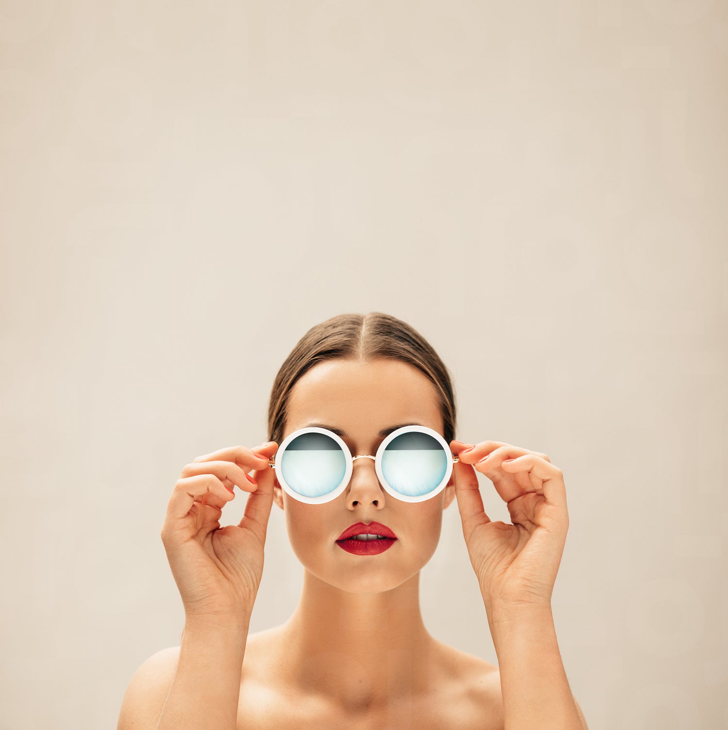 Square portrait of young woman with sunglasses against beige background. Caucasian female fashion model posing with glasses.