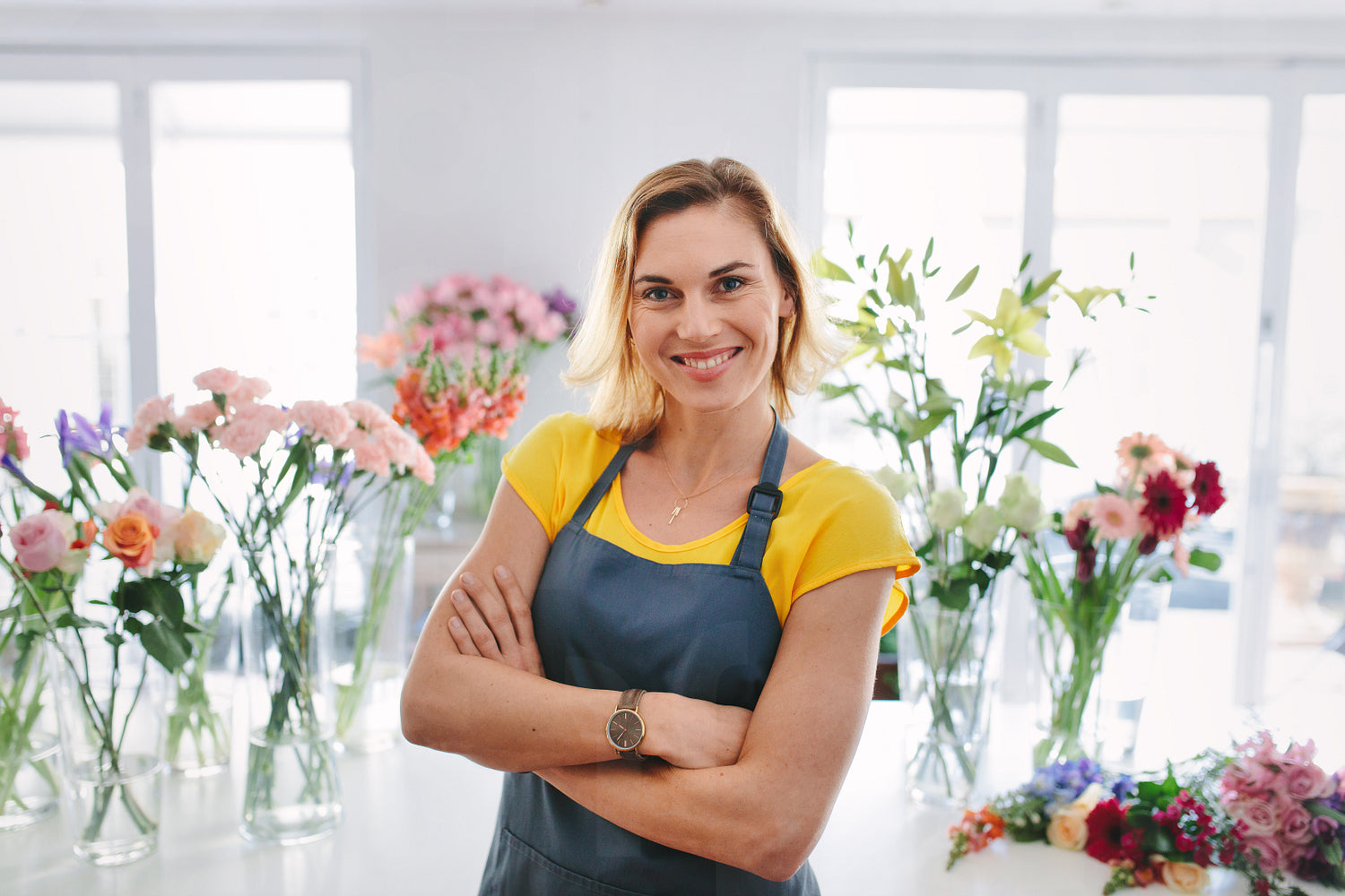 Positive flower shop owner looking at camera and smiling. Small business owner.
