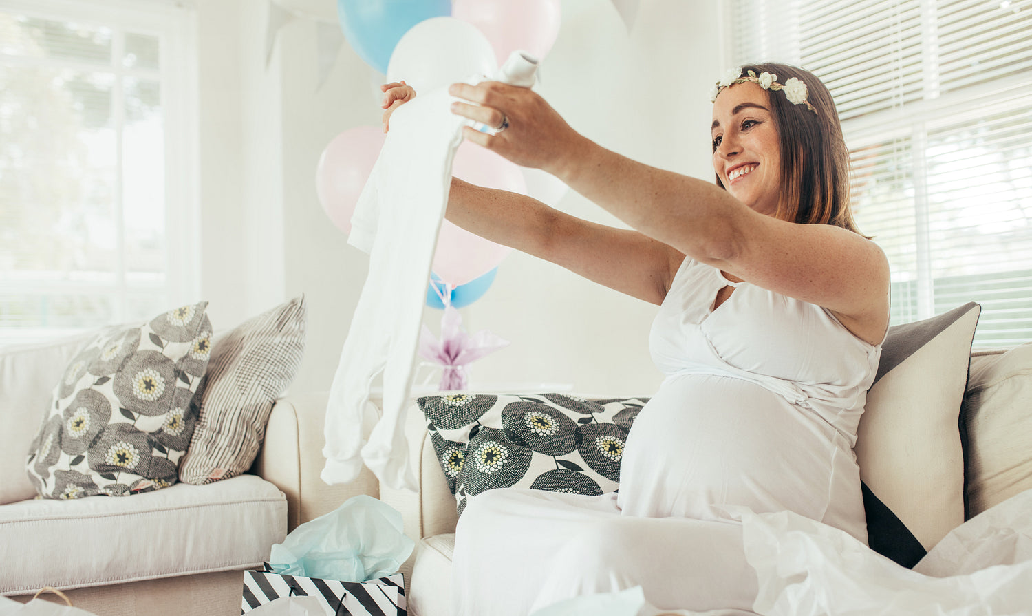 Smiling young pregnant woman sitting on sofa with presents at baby shower party. Expecting mother looking at clothes of child and smiling.