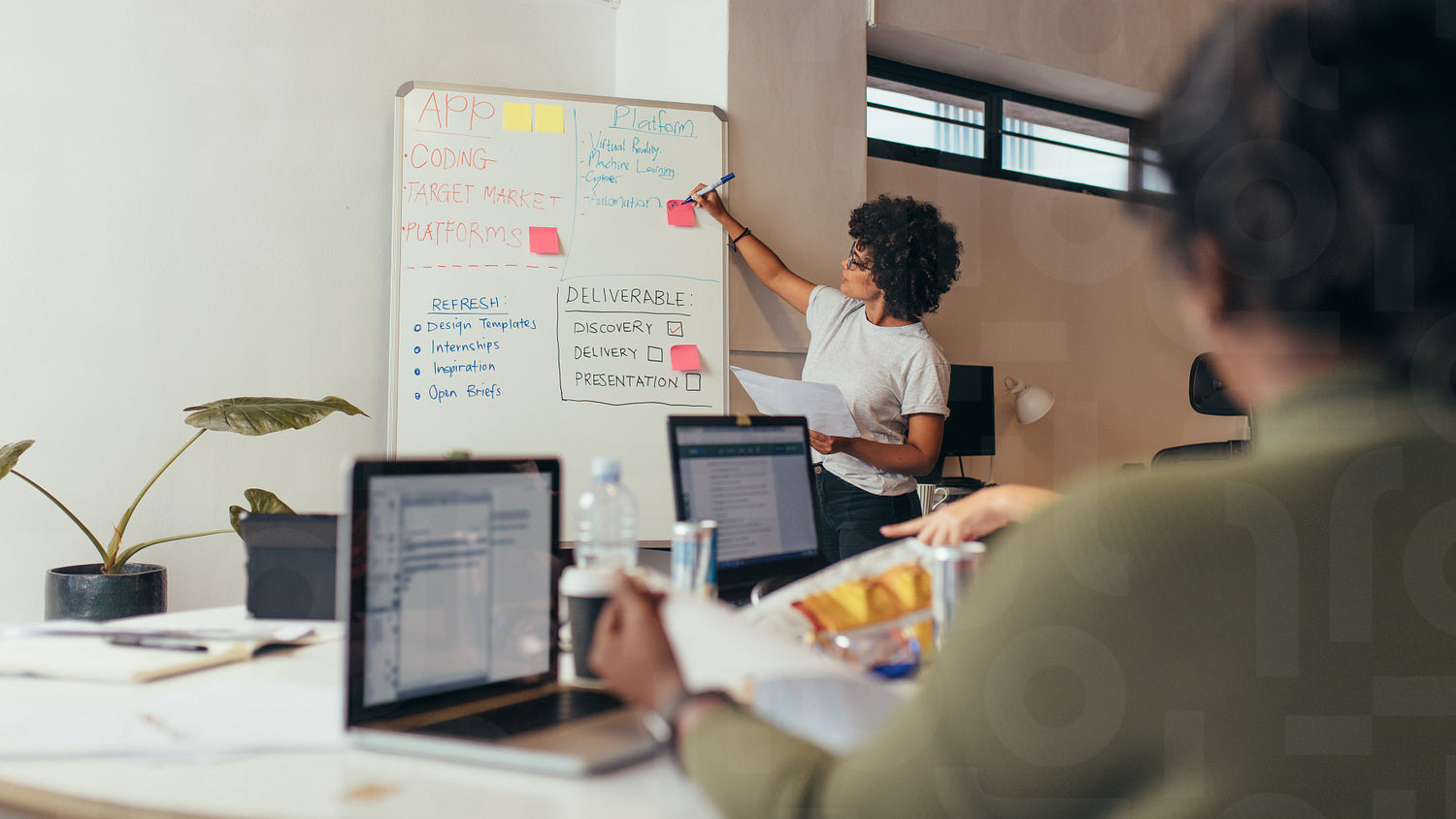 Team leader discussing and brainstorming new approaches and ideas with colleagues over new project. Business presentation at software development company.