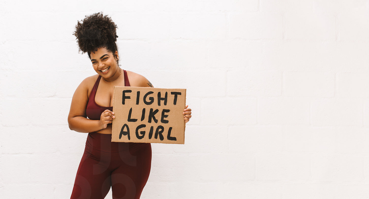 Attractive woman holding placard of "Fight like a girl". Female in sports clothing standing against white background.