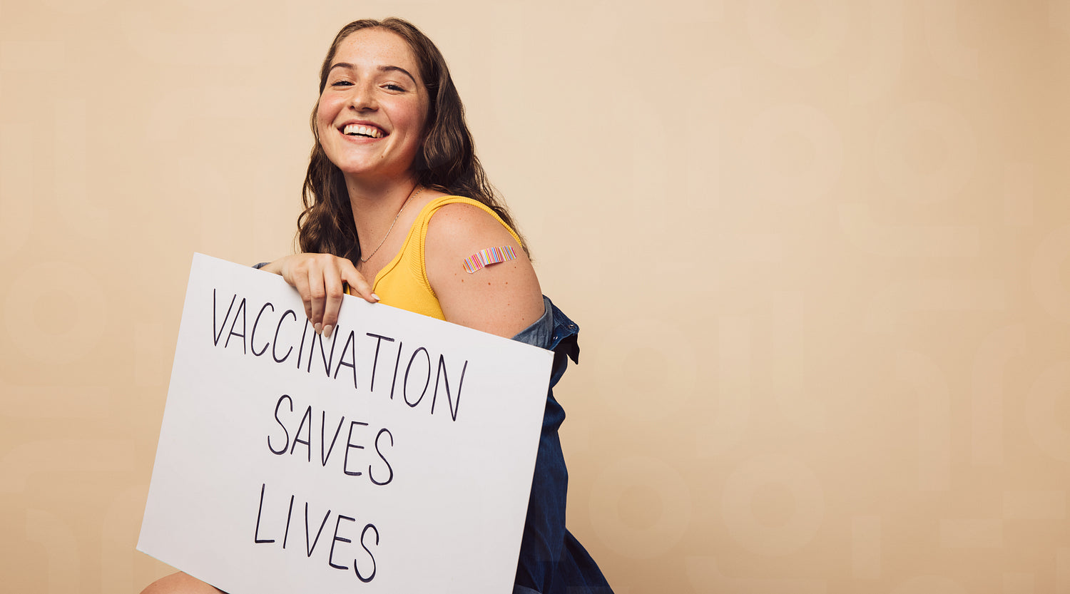 Beautiful young woman holding a banner with "vaccination saves lives" slogan. Woman holding a banner on brown background looking at camera and smiling.