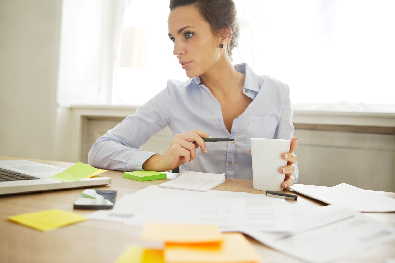 Beautiful young woman looking at laptop while at work. Caucasian young businesswoman working in home office.