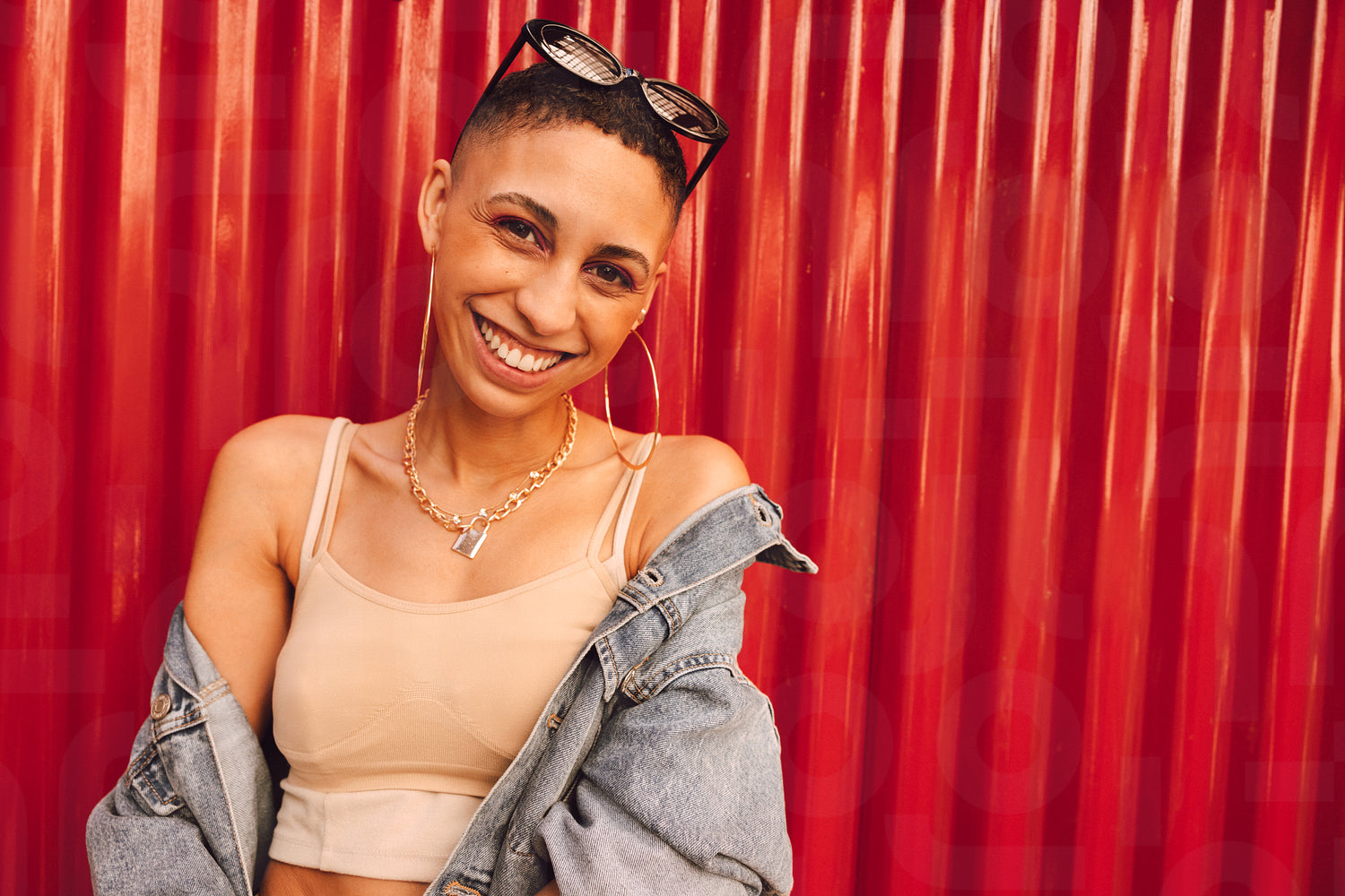 Pretty young woman smiling at the camera while standing alone against a red background. Carefree young woman feeling vibrant and full of life.