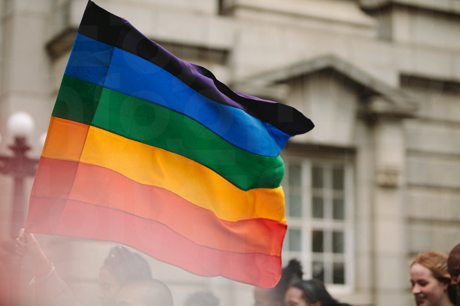 Gay rainbow flag seen during pride parade in the city. Parade goers participate in gay pride march.