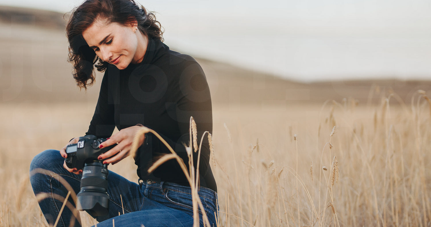 Woman checking pictures on professional digital camera. Pro photographer outdoors with a dslr camera.