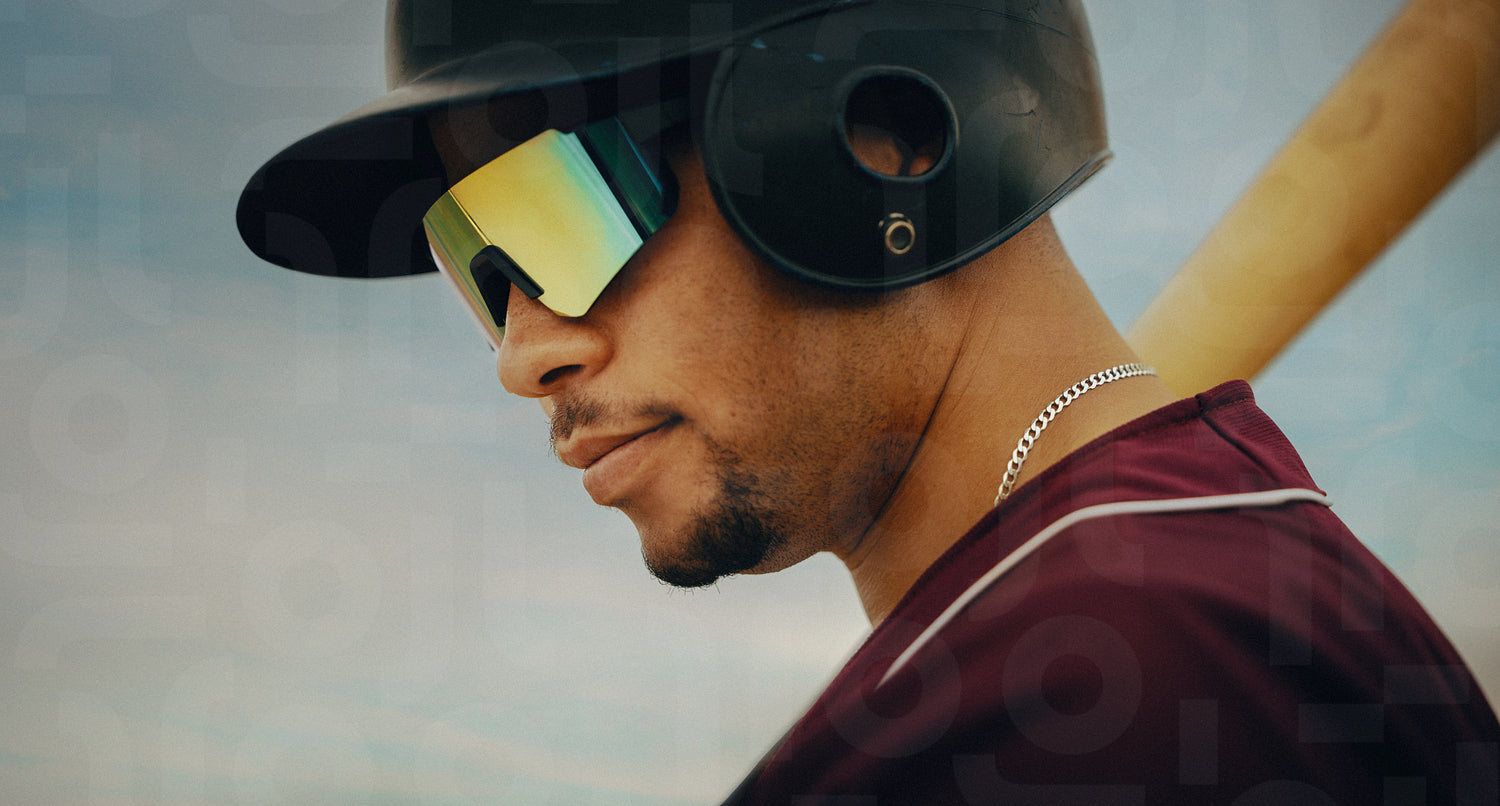Professional baseball player wearing a uniform and helmet with sunglasses