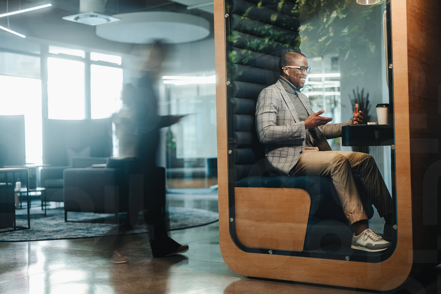Professional businessman using a laptop for a virtual meeting in a privacy booth