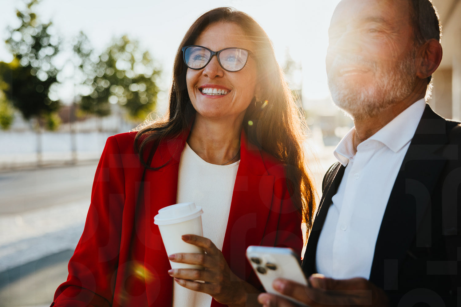 Senior business professionals enjoying an outdoor break while holding coffee and smartphone under sunlight