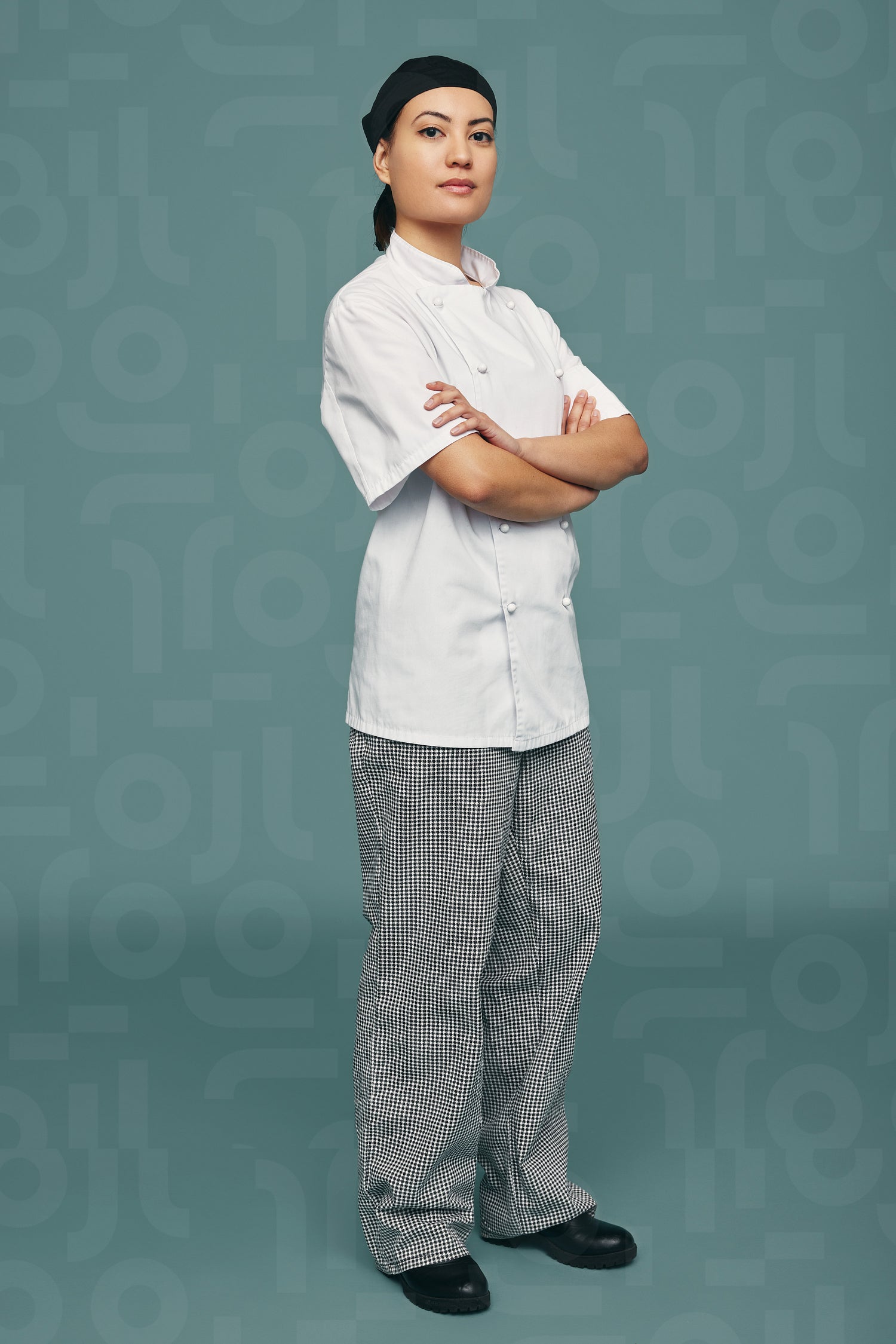 Professional cook looking at the camera while standing with her arms crossed. Confident female chef wearing a white coat and a black bandana against a studio background.
