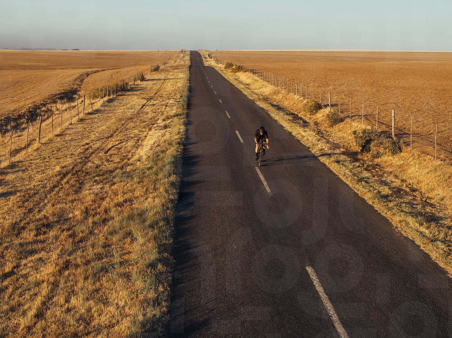 Aerial view of cyclist practicing on long road. Professional athlete cycling on countryside landscape road.