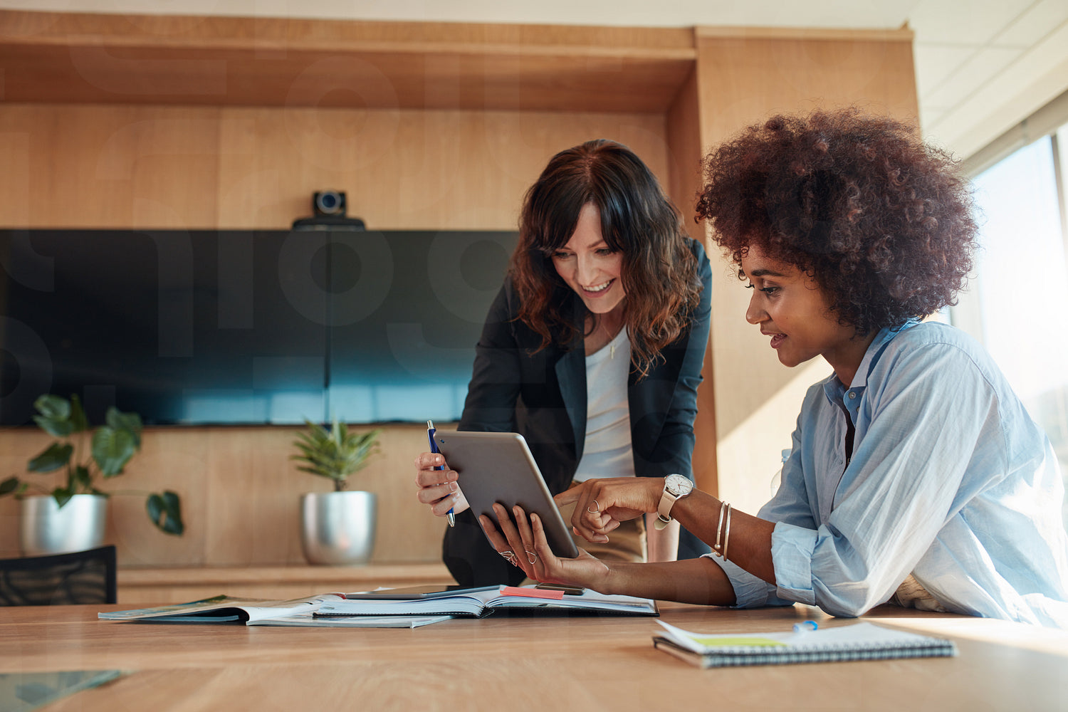 African businesswoman showing something on digital tablet to her female colleague while sitting at her desk. Professional employees discussing ideas of project on tablet pc.