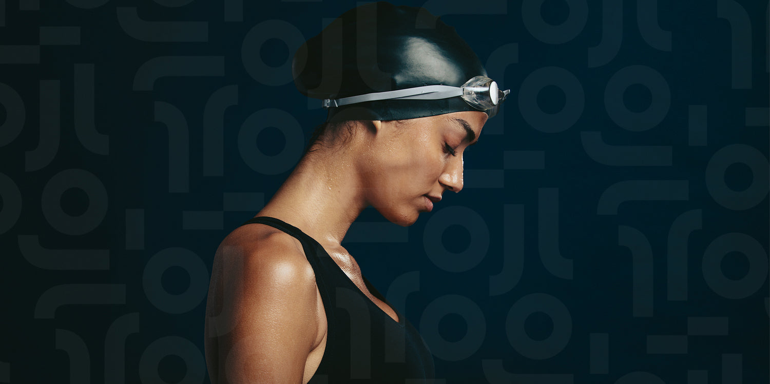 Side view of a professional female swimmer with goggles and a hat. Woman wearing black swimsuit, swimming cap and goggles on dark background looking exhausted.