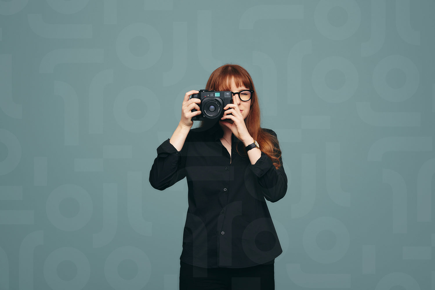 Professional photographer taking a picture on her digital camera. Young female photographer looking through camera lenses while standing against a studio background.