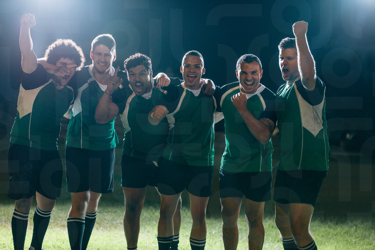 Professional rugby players celebrates a victory on a sports arena. Group of rugby players screaming and punch air after winning the game on sports field.