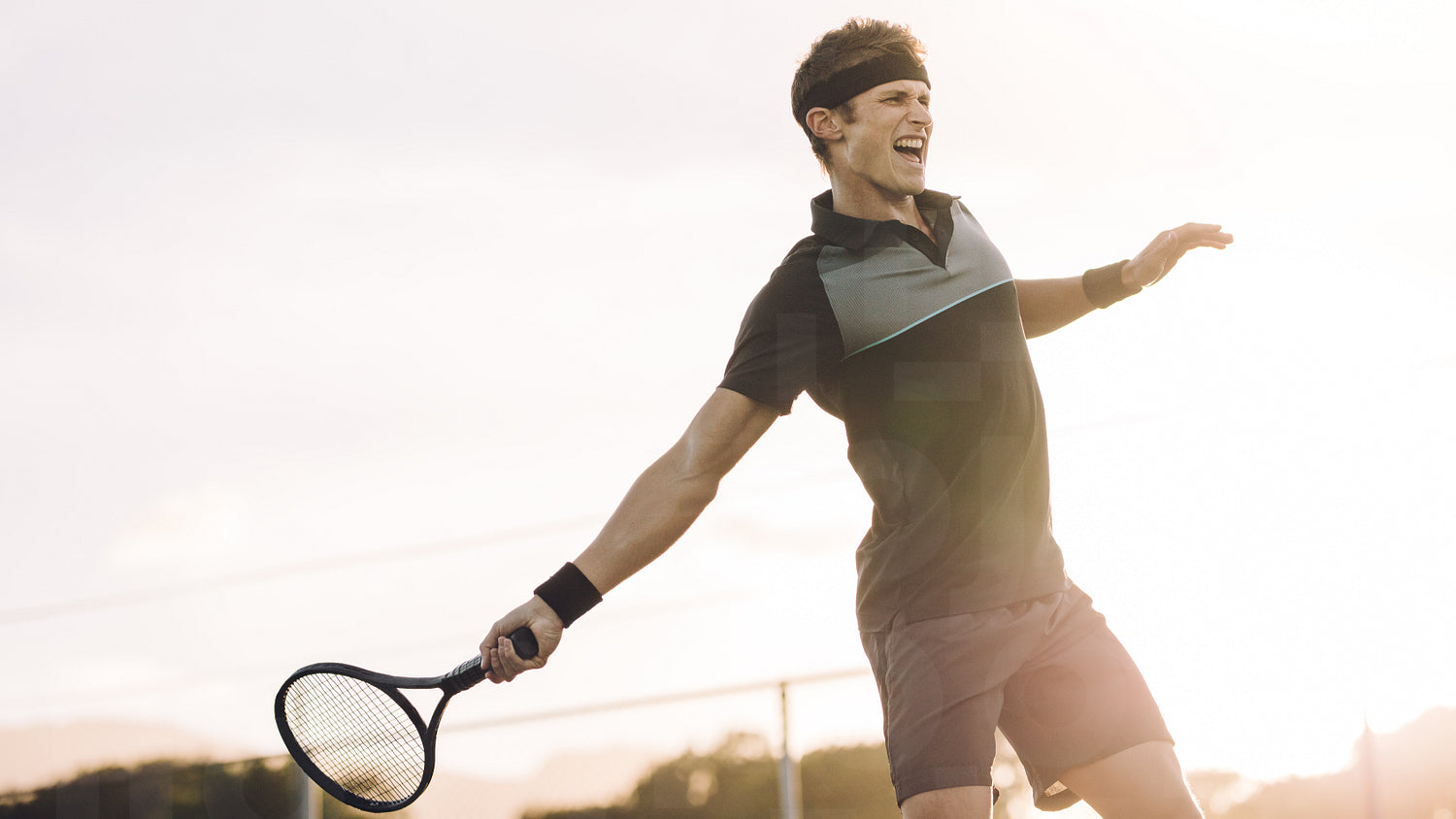 Young player playing tennis on hard court on a sunny day. Professional tennis player hitting a forehand winner during a match.