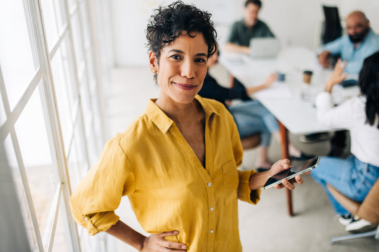 Professional woman using a cellphone in an office. Business woman standing in a boardroom and looking at the camera. Reading client text messages at work.