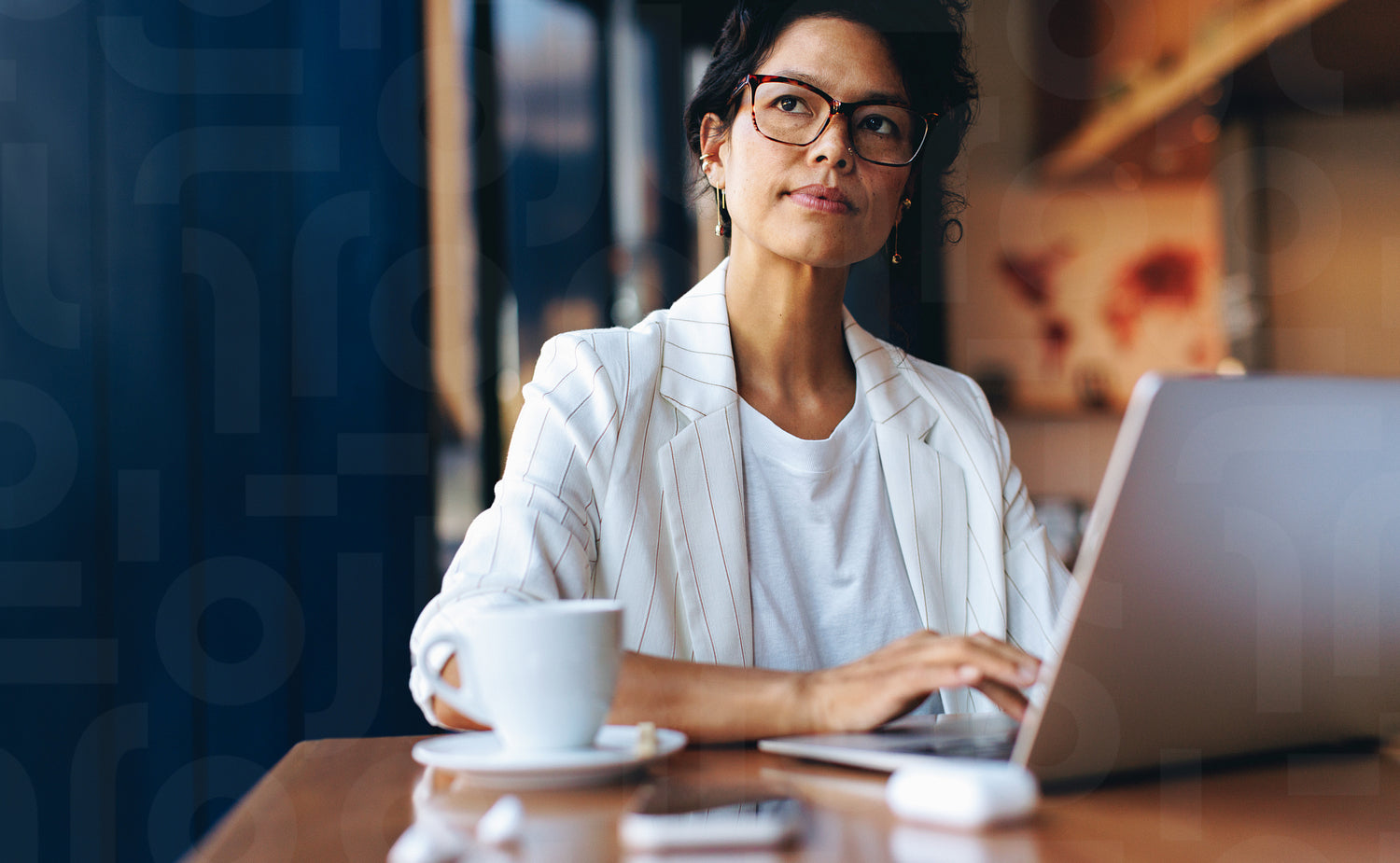 Professional woman working remotely on a laptop at a cafe, contemplating ideas. Freelancer wearing business casual attire.